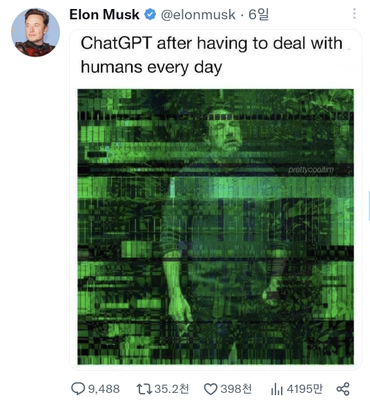 엘론 머스크 – 퇴근 후 ChatGPT 2023년 03월 25일 by issue 인간의 모든 질문에 답하느라 힘든 하루를 보내고 있습니다....ChatGPT의 모습. '추천 관련글, ChatGPT 소개 및 ChatGPT 블로그에 유용하게 사용하는 방법일기 23.04.15(AI Generated Novel) 패배한 영웅 - 프롤로그 (GPT 4 버전)유재석, 아들 위해서..100명한테