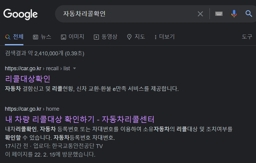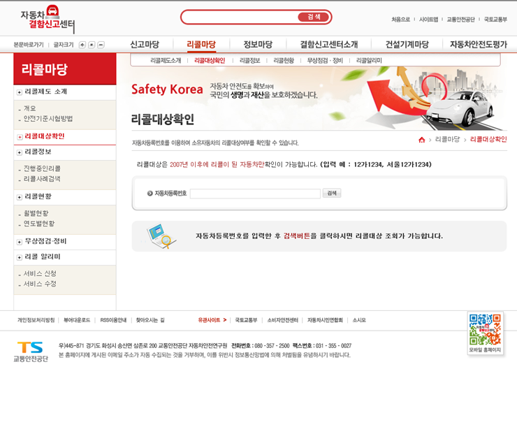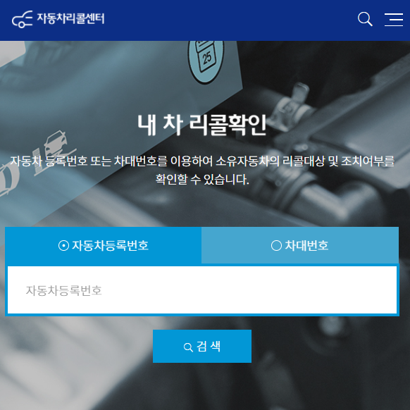 검색창에 차량 리콜 센터를 입력하면 바로 사이트가 표시됩니다.자동차 등록번호와 차대번호를 이용하여 리콜 대상 여부를 확인할 수 있습니다. 제 차 등록번호를 검색해보니 예전에 연료소비율 관련 리콜이 있었네요. 쉽게 확인할 수 있어 편리합니다.