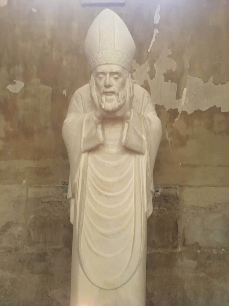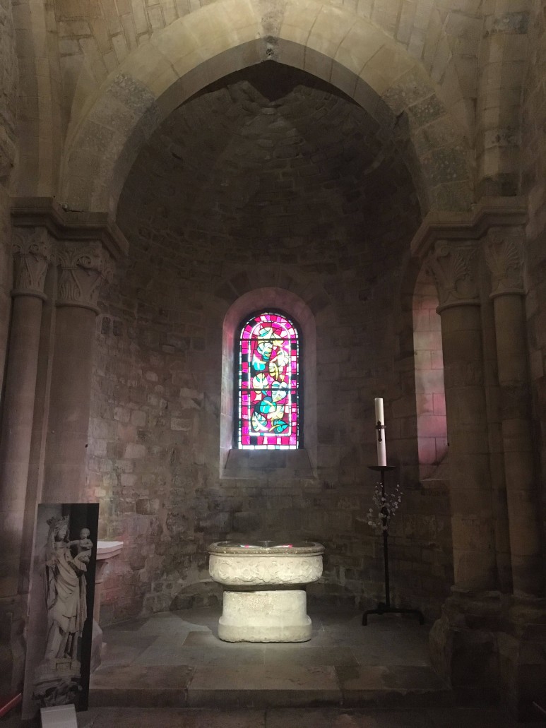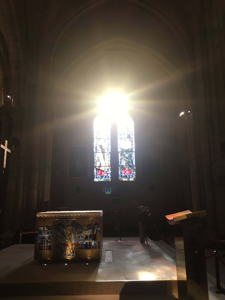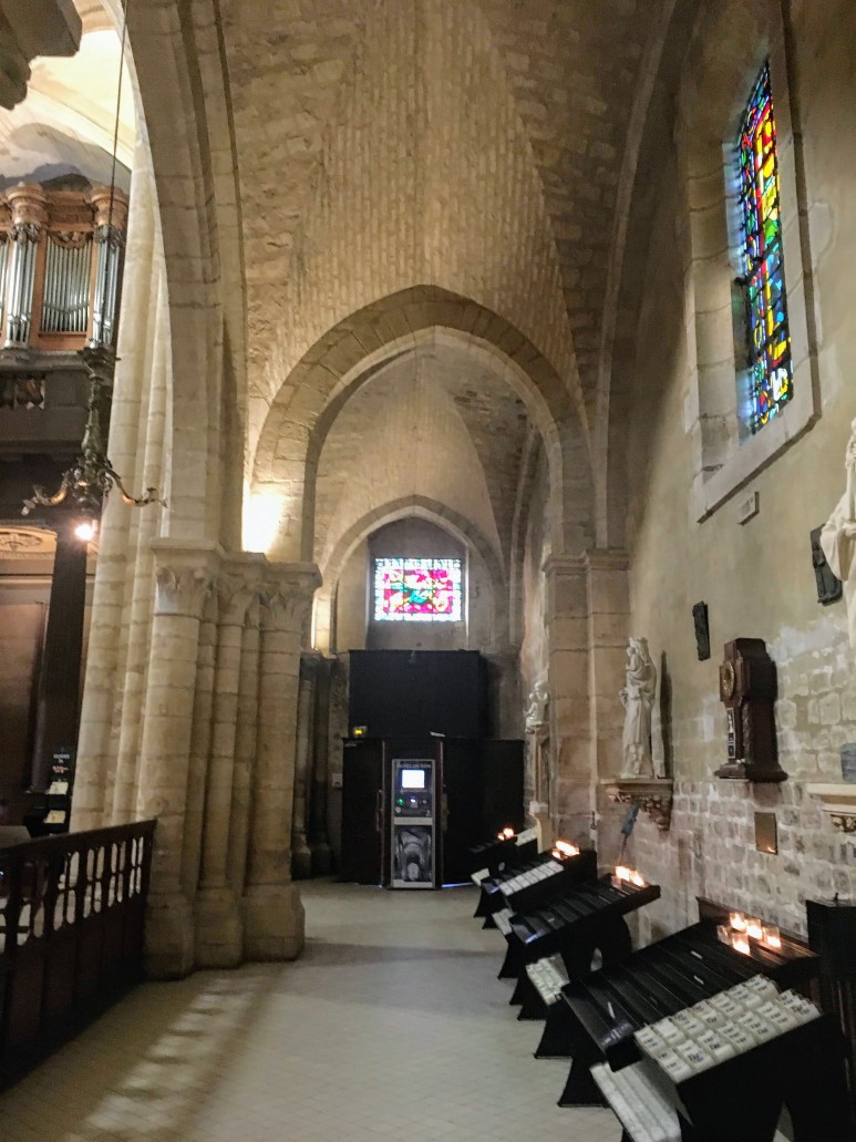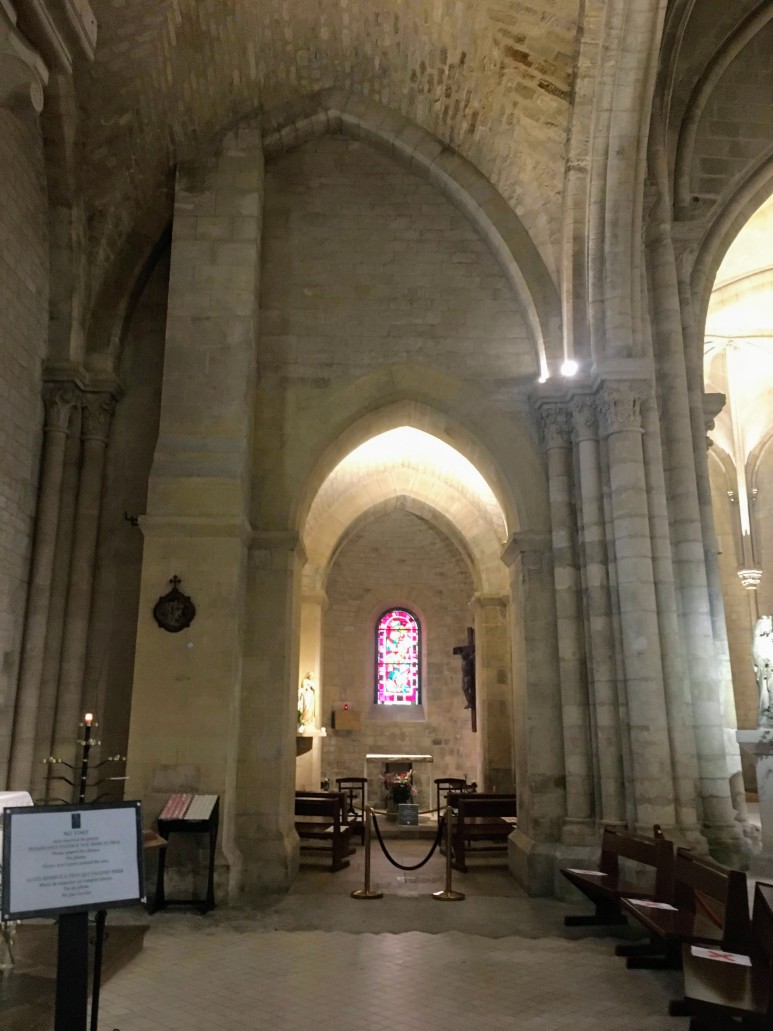 신도석을 덮고 있는 아치형 천장은 15세기에 제작되었지만 스테인드 글라스 창은 20세기에 제작된 것입니다. Max Ingrand의 작품입니다. 금고와 성단에는 원래 7세기 교회에서 보존된 4개의 검은 대리석 기둥이 있습니다.
