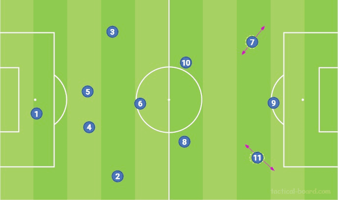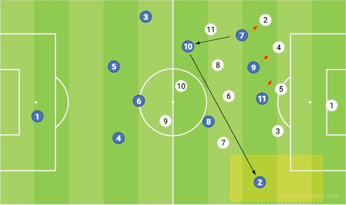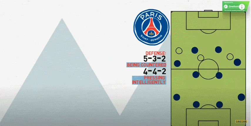 파리에서 Tuchel이 가장 좋아하는 포메이션은 Neymar를 자유롭게 만드는 4-3-3입니다. 트레이너가 사용하는 다른 형태로의 전환에는 몇 가지 흥미로운 기능이 있습니다. 첫째, 파리의 공격은 특히 하프 스페이스나 측면에서 풀백이 전진하는 동안 정기적으로 흔들립니다. 이 두 가지 모두 미드필드에서 수적 이점을 창출할 뿐만 아니라 스트라이커를 덮는 것을 방지하고 특히 풀백을 위해 침투하고 돌아설 공간을 만듭니다.