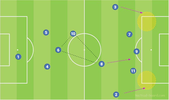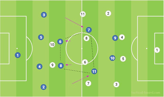 중원에서도 역시 셋은 다소 엇갈린다. 중앙에서 가장 수비적인 미드필더는 센터백 근처에 고정되어 있지만 종종 깊은 두 번째 영역에서 볼 분배 역할을 하는 다른 중앙 미드필더와 연결됩니다. 세 번째 미드필더는 더 높이 전진하여 공격 옵션을 제공하거나 필드 한쪽에 있는 상대보다 수적으로 유리합니다. 또한 한 구역에서 이러한 수적 우세에 이어 다른 구역을 공격하기 위한 빠른 전환 게임이 이어집니다.