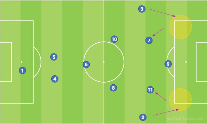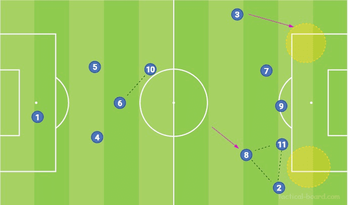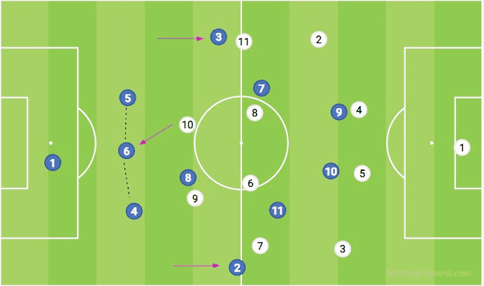 파리에서 Tuchel이 가장 좋아하는 포메이션은 Neymar를 자유롭게 만드는 4-3-3입니다. 트레이너가 사용하는 다른 형태로의 전환에는 몇 가지 흥미로운 기능이 있습니다. 첫째, 파리의 공격은 특히 하프 스페이스나 측면에서 풀백이 전진하는 동안 정기적으로 흔들립니다. 이 두 가지 모두 미드필드에서 수적 이점을 창출할 뿐만 아니라 스트라이커를 덮는 것을 방지하고 특히 풀백을 위해 침투하고 돌아설 공간을 만듭니다.